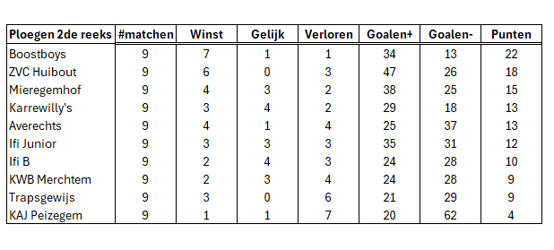 Rangschikking Competitie 2de Afdeling